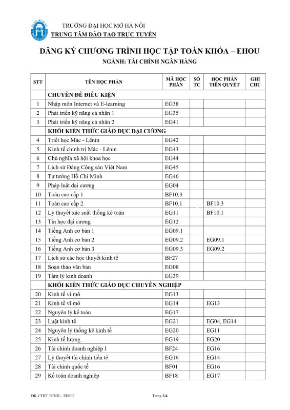 Khung chương trình học ngành tài chính ngân hàng – Trường Đại Học Mở Hà Nội