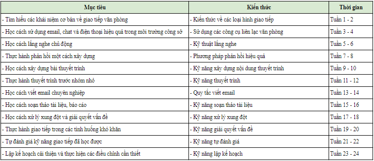 Ví dụ: Về kỹ năng giao tiếp cho sinh viên mới ra trường: Trong vòng 6 tháng, phát triển và cải thiện kỹ năng giao tiếp văn phòng, bạn có thể tạo một bảng kế hoạch như sau: